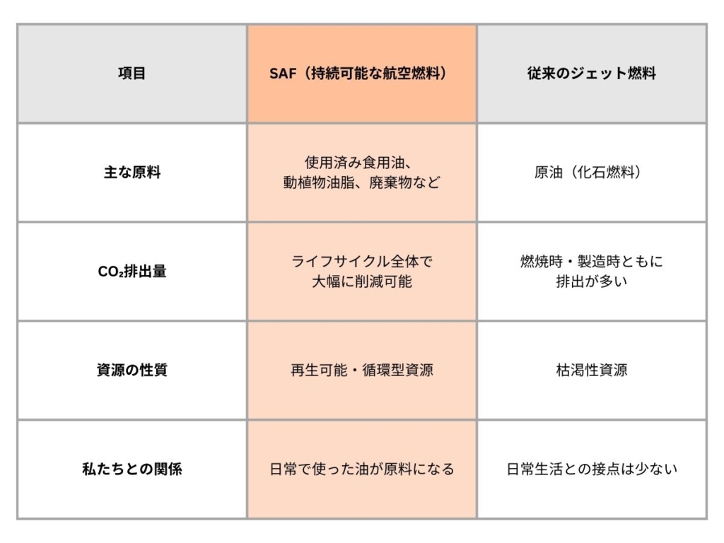 SAFと従来のジェット燃料との違いは以下のとおりです。
